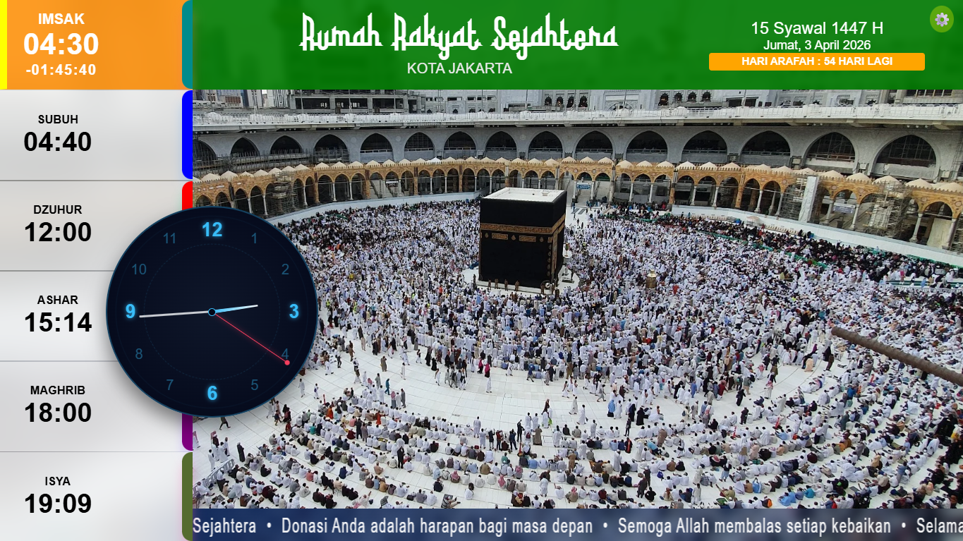 Yayasan Rumah Rakyat Sejahtera (YRRS) Jakarta meluncurkan program bantuan pengadaan jam TV digital masjid untuk musholla dan masjid di wilayah Jawa. Bantuan ini bertujuan untuk membantu pengelolaan waktu ibadah yang lebih tepat dan memudahkan para jamaah dalam mengikuti jadwal sholat dan informasi informasi yang telah di buat oleh DKM. Program ini merupakan langkah awal YRRS dalam upaya meningkatkan kualitas fasilitas rumah ibadah di Indonesia.